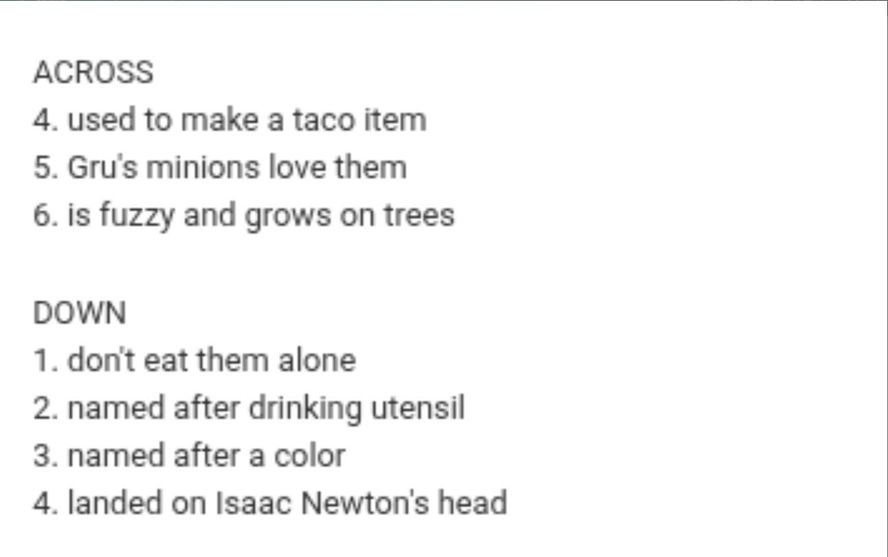 Across: Avocado, Banana, Peach